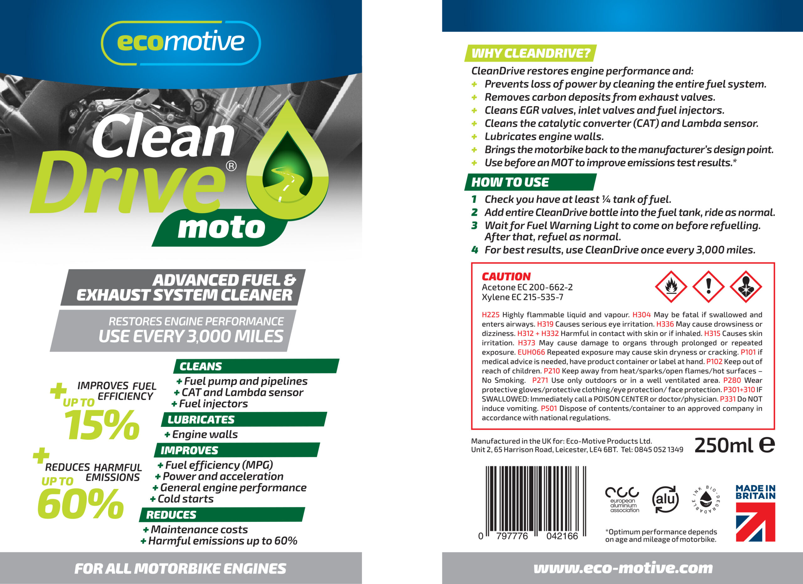 • CleanDrive® is scientifically proven to enhance the fuel efficiency and overall performance of any motorbike by improving the combustion process and fuel efficiency of the engine.
